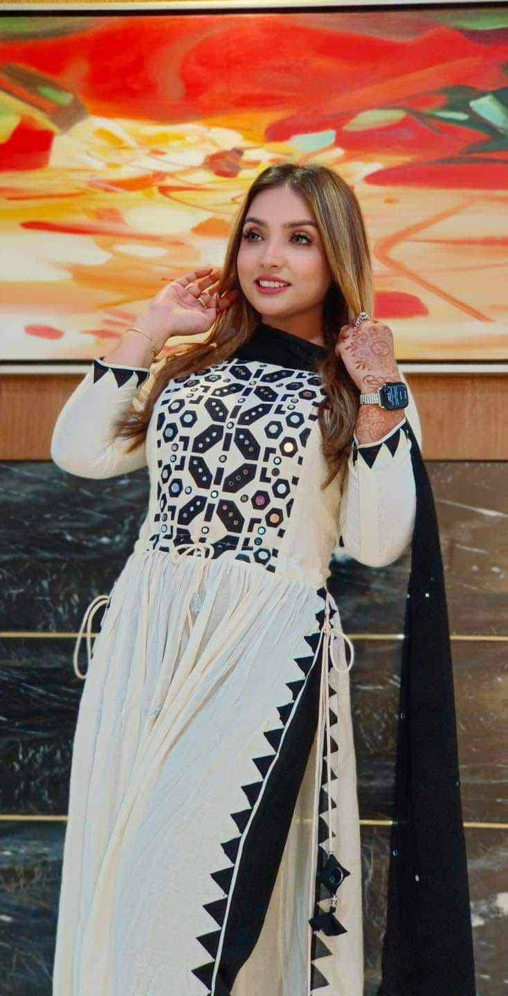 রেডিমেড নায়রা কাট থ্রি- পিছ।✅জামা: বডি ৪৪" লং ৪৫+বুকে রিয়েল মিরর এর কাজ করা।✅অরনা সেমি পিওর শিফন জরজেট। ফুল অরনা তে স্টন করা আছে।✅সেলোয়ার ইন্ডিয়ান সফট বাটার সিল্ক সম্পুর্ন বানানো থাকবে